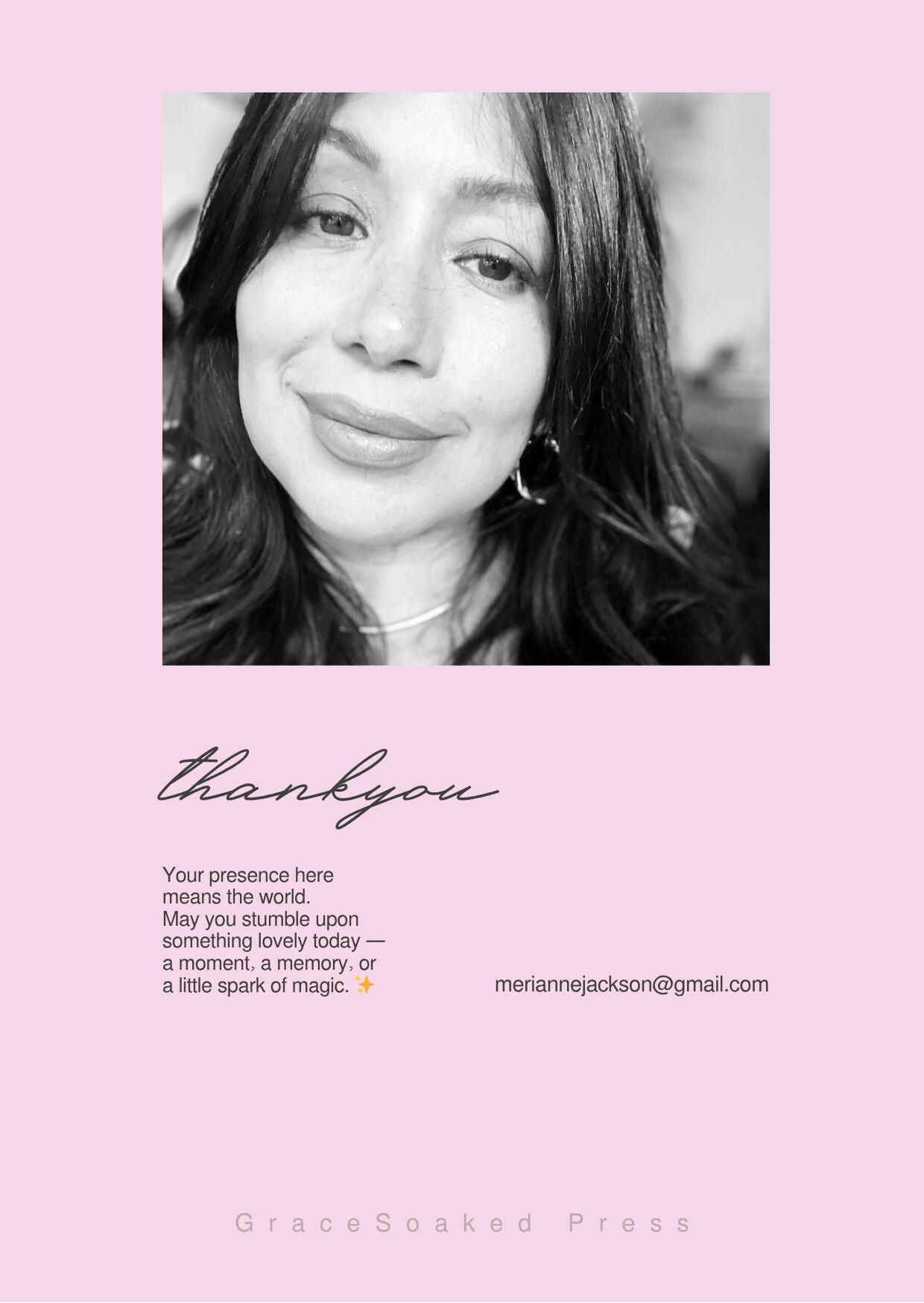 Hello and welcome—I'm Merianne, the creative heart behind GraceSoaked Press. As an author, mother, and dreamer, my passion lies in crafting beautiful, thoughtful books designed to inspire creativity, mindfulness, and joy.At GraceSoaked Press, every journal, coloring book, and children's story is created with love, intention, and a dash of sass. Whether you're here to find your next favorite coloring adventure, a journal to guide your reflections, or enchanting stories for the little ones, you're in the right place.My journey as a creator has been deeply personal, shaped by life's experiences, motherhood, and the vibrant energy of my Latina heritage. I believe in embracing life's beauty, imperfections and all, and celebrating the everyday moments that inspire us.Thank you for visiting GraceSoaked Press. I hope you find something here that resonates with you deeply, bringing inspiration, laughter, and warmth into your life.With love,Merianne—Feel free to connect or say hello through the contact page—I'd love to hear from you!